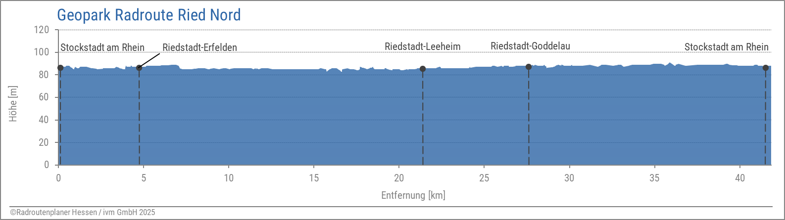 Die Nordroute (40 km) führt zunächst über den Kühkopf in die Knoblochsaue und zum Rheinufer, dann über die Riedstädter Ortsteile Erfelden, Goddelau und Wolfskehlen zum Philippshospital und zurück zum Kühkopf.